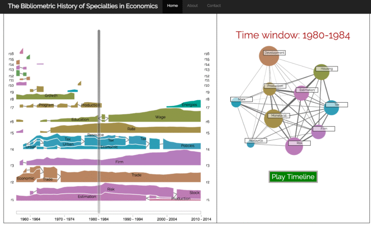 The website dedicated to this project is here. The web app in this project allows the user to explore the evolution of specialties in economics since the late 1950s. Other web apps will be added. Read more